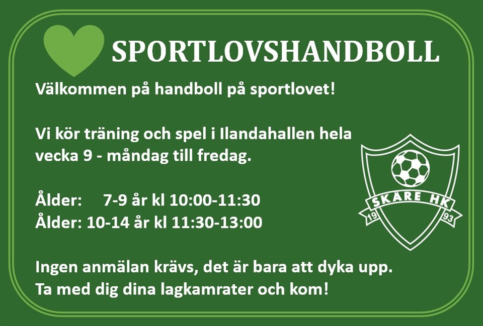 Save the date Nu är det dags att boka in datum för säsongsavslutningar. Födda 2014-2017, den 24 mars Födda 2013 och äldre, den 14 april Ledaravslutning, preliminärt på kansliet den 22 april. Säsongsavslutningarna kommer att vara på Ilandahallen, aktuella tider kommer inom kort. Vi behöver fortfarande hjälp för att arrangera avslutningarna, se tidigare inlägg om detta. Helgens matcher Det är en vilohelg för de flesta, förutom P11 som åker till grannkommunen och spelar 2 matcher. 2024-02-25 Hammarhallen P11* 11:10 IF Hellton – Skåre HK Vit 12:20 IFK Hammarö 3 – Skåre HK Vit *avser serie/ålder, ej födelseår Motionshandboll söndag 25/2 (junior-pensionär) Ilandahallen 19:00-20:30 Veckans höjdpunkt - ta med en vän och kom! Sportlovshandboll Kom och spela handboll på sportlovet med Skåre HK. Se tidigare inlägg om handboll i Ilandahallen på sportlovet – ingen föranmälan krävs. Sommarjobb 2024 Nu är det dags att söka sommarens roligaste jobb – se tidigare inlägg för all information.