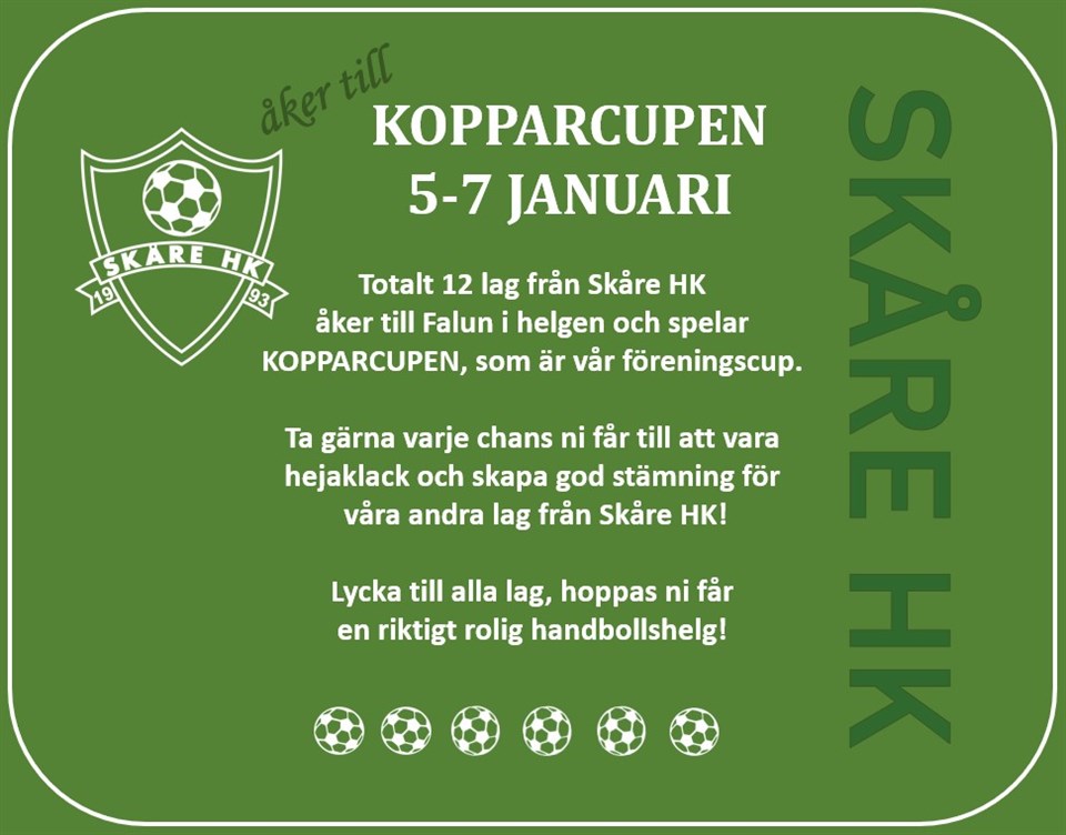 Vilken helg det blev i Falun - fullt ös från start, med grön hejaklack i publiken - direkt i gruppspelet. Så roligt att se (och höra) när alla Skåre-lag hejar på varandra! Hoppas att alla lag har samlat många fina och roliga minnen från helgen! Många fina resultat blev det också, flera lag tog sig till A-slutspel. P12 kan vi gratulera till en vinst och guldmedalj i B-slutspelet. Bra kämpat alla spelare, ledare och supportrar och tack för en fin insats för Skåre HK i Kopparcupen 2024.
