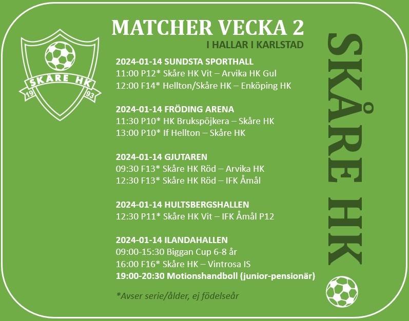 Helgens alla matcher vecka 3 2024-01-20 Deje Sporthall F11* 13:20 IF Hellton – Skåre HK vit 14:40 HK Brukspöjkera – Skåre HK vit 2024-01-20 Karlsbergshallen Åmål F11* 16:30 IFK Kristinehamn – Skåre HK F12 17:45 IFK Åmål – Skåre HK F12 2024-01-20 Sundsta Sporthall F14* 12:00 IF Hellton/Skåre HK – IFK Kristinehamn 2024-01-21 Karlsbergshallen Åmål F10* 09:30 IFK Åmål – Skåre HK svart 2024-01-21 Gjutaren F13* 10:00 IF Hellton röd – Skåre HK grön 11:30 IF Hellton röd– Skåre HK röd 2024-01-21 Hammarhallen, Hammarö F13* 11:10 Skåre HK vit – IFK Kristinehamn 12:20 IFK Hammarö – Skåre HK vit 2024-01-21 Sundsta Sporthall P16* (arrangör) 11:30 Skåre HK-Örebro SK 2024-01-21 Stenstalidshallen Kristinehamn P11* 13:15 IFK Kristinehamn – Skåre HK grön 14:30 IF Hellton Karlstad - Skåre HK grön 2024-01-21 Ilandahallen P19* (arrangör) 13:30 Skåre HK – Eskilstuna Guif IF 17:30 Eskilstuna Guif IF – Skåre HK *avser serie/ålder, ej födelseår Obs! Motionshandbollen på söndag 21/1 är inställd.