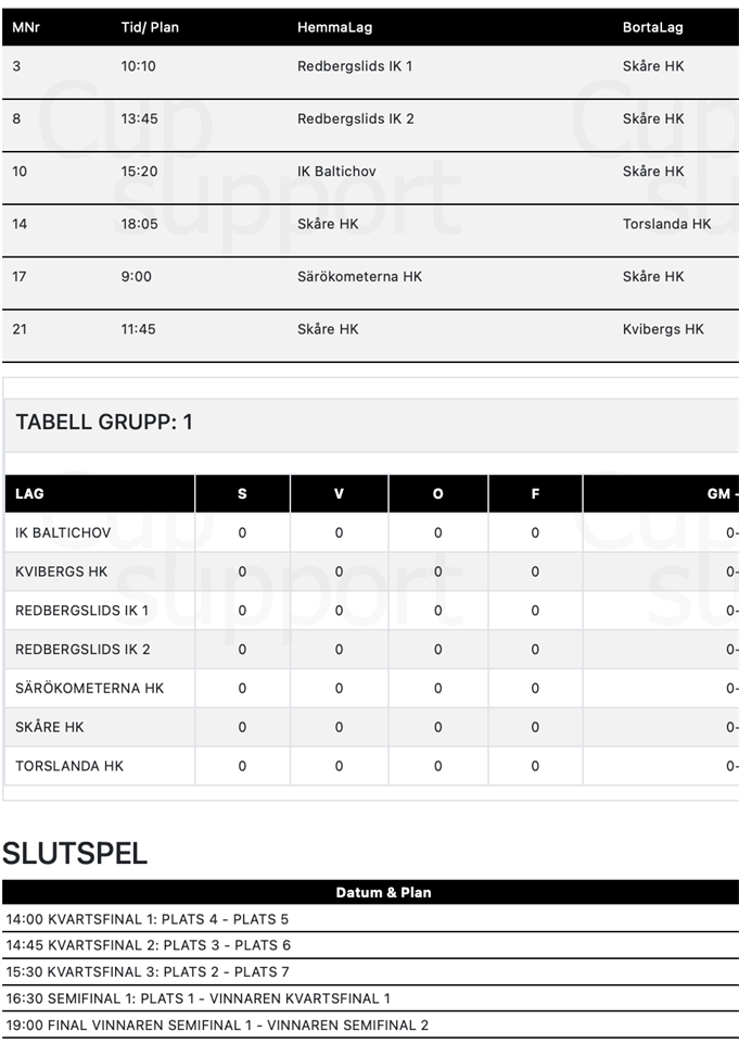 Hej, alla ledare! Här kommer lite information om kommande föreningscup som i år kommer att bli Kopparcupen i Falun och som 2023 går av stapeln 5-7 januari 2023 i Falun. Skåre HK har haft Kopparcupen som föreningscup flera gånger genom åren och den räknas som en av de absolut bästa cuperna för detta syfte, eftersom i princip alla matcher spelas under samma tak - eller i omedelbar närhet - vilket innebär att det är mycket lättare för de olika lagen att stötta varandra. Läs mer om Kopparcupen här » Vad föreningen betalar för - Föreningen kommer som tidigare när det gäller föreningscup att betala startavgiften för de anmälda lagen, inklusive deltagarkort för maximalt fyra ledare/lag. Självklart får fler ledare följa med, men då betalas övriga ledares deltagaravgift av lagen själva. Förtydligande: Föreningen betalar deltagaravgiften för ledare på hårdförläggning. - Max två lag per kön och åldersklass (exempelvis F07, P11 etc) kan anmälas, om ni anser att ni har tillräckligt med spelare för det samt att ni anser att det behövs för att garantera tillräckligt med speltid för samtliga spelare i laget. - Observera att deltagaravgifter för spelare betalas av lagen själva. Anmälan till föreningen - senast 13 september Saken är den att det är lite bråttom. Själva anmälan till Kopparcupen genomförs gemensamt för alla lag 16 september kl 20:00. Vi måste senast 13 september få besked från er ledare: - Hur många lag som ni känner att kan delta med (max 2 per ålderklass) - Uppskattningsvis hur många ledare ni tar med er (detta kan ändras senare) - Uppskattningsvis hur många spelare per lag (detta kan ändras senare) - Kontaktuppgifter till en kontaktperson i laget (namn, e-post, mobilnummer etc). Skicka din anmälan till p@ljunglof.net Ålderklasser som kan vara med 2023 Flickor/Pojkar 16/15 (född 06 eller senare) Flickor/Pojkar 14 (född 08 eller senare) Flickor/Pojkar 13 (född 09 eller senare) Flickor/Pojkar 12 (född 10 eller senare) Flickor/Pojkar 11 (född 11 eller senare) Flickor/Pojkar 10 (född 12 eller senare) Anmälan görs som sagt till e-postadressen p@ljunglof.net, SENAST 13 september. Har ni funderingar är det bara att höra av er. Slå mig en signal på 0730-447737. Ha det gôtt så länge så hörs vi framöver. Styrelsen, genom Peter Ljunglöf