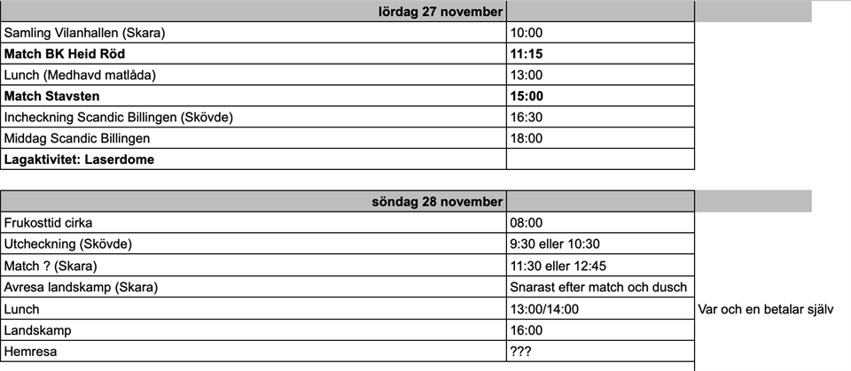 Hej! Lite tidigt ute men 27-28 november ska vi spela USM i Skara och kul att alla spelare kommer med! Jag har gjort ett preliminärt schema och vi ska förutom spela handboll i Skara, spela laserdome och gå på damernas handbollslandskampen i Skövde. Kostnaden håller vi på att se över, dvs hur stor del vi tar från befintlig lagkassa.