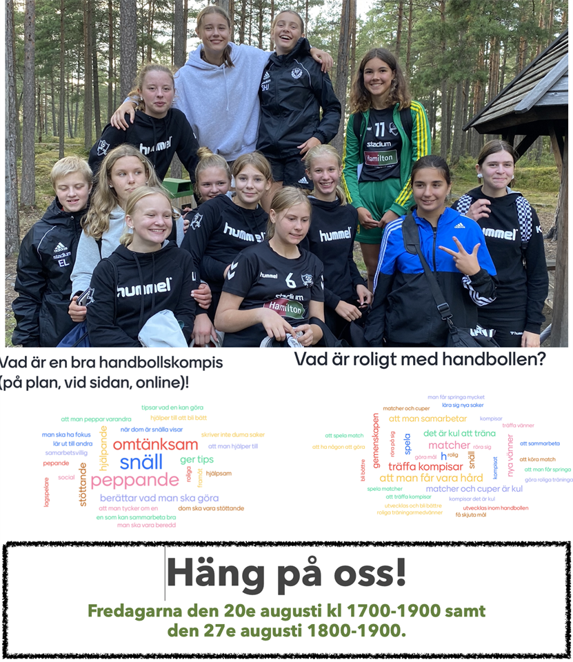 Vi är ett positivt gäng på 15 tjejer som tränar/spelar handboll i Skåre hk och vi ska smyga igång träningen för säsongen. Vi hoppas att du vill komma och se och testa lite handboll med oss? Det skulle bli jättekul! Ett par inneskor räcker. Mentor : Som ny kommer du få en till två tjejer i laget som dina mentorer under första året. Deras uppgift är att hjälpa dig med saker som du funderar på eller vill ha hjälp med. Självklart hjälper alla alla, men såhär får du ett extra stöd på och runt handbollen. (Klicka på bilden ovan så ser ni vad tjejerna svarade på två frågor vid en lagaktivitet i förra veckan. Klara och Husna saknas tyvärr på bilden) Var: Idrottshallen Gjutaren på Herrhagen (Bakom Nöjesfabriken) När: Fredagarna den 20e augusti kl 1700-1900 samt den 27e augusti 1800-1900. Hur: Ta med ett par inneskor och ett glatt humör, det räcker långt. För mer info kontakta Fredrik Östlin,tränare, 0760-389222 fredrikostlin@gmail.com