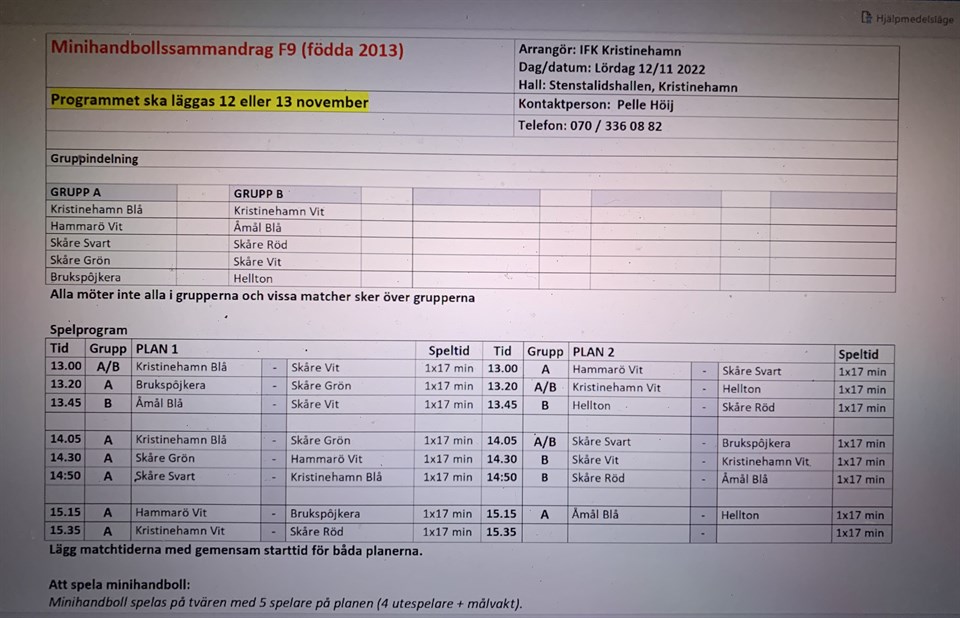 Hej föräldrar med barn (P12) som ska spela matcher på söndag13 november! Dags för matchdag igen och alla föräldrar kommer att behöva hjälpa till med olika uppgifter under säsongen. Till helgens matcherna har vi satt upp ansvariga föräldrar enligt nedan. Hoppas att det funkar, annars ber vi er byta med varandra. Matchvärd 9:15 - sista matchen är klar : Samuel Andernord Info: se nyhet från 7 okt Sekretariat 9:15 - sista matchen är klar: Nils Eklind och Edvin Twedmark (även plocka fram och undan sek) Läs igenom sekretariatsinstruktionen innan, den finns på skarehk.se under Dokument och Sekretariat. Kiosk 9:15 - ca 11:30 Berat Dogan och Nils Rosengren (även plocka fram från kioskförråd) Kiosk 11:30 - tills och alla hunnit köpa det godis de vill efter sista matchen: Emmet Eriksson och Ebbe Persson (sedan plocka in i kioskförråd) Baka fikabröd: Valter Ruuth (T.ex. en långpanna) Vänliga hälsningar Planeringsmammorna Karin S (Linus J:s mamma), Karin C (Egils mamma) och Anna B (Linus P:s mamma)