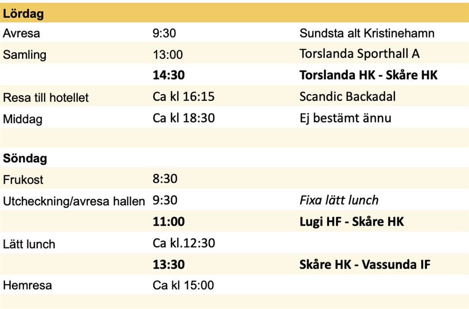 Hej! Nu har pusslet lagt sig gällande USM-resan i helgen. Följande förslag till reseplanering har jag sammanställt. Se nedan 1.Funderingar, funkar detta? 2. Finns en plats till utifall Kjelle vill haka på? 3. Vilken tid ska Karlstadkillarna vara i Kristinehamn? 4. Boende och frukost på Scandic Backadal. Kostnad 715 kr per spelare (Swisha mig på 0760-389222), vi saknar en gemensam lagkassa så vi har ingen buffert. Vi får ett USM-bidrag på 160 kr per spelare/ledare som jag begär ut från klubben och swishar åter till er efteråt. Reseersättning får vi för resan, jag begär ut den och fördelar mellan bilarna utifrån antalet spelare/ledare per bil. Frågor och funderingar tar vi i SMS-gruppen för spelare i USM alternativt SMS-gruppen för USM-föräldrar! Bil 1: Anton (avresa Sundsta 09:30) Samuel Tristan Teo Bil 2: André (avresa Sundsta 09:30) Oscar Torkel Bil 3: Hampus (avresa Kristinehamn tid ????) Benjamin Isak Joel Bil 4: Linus Erik