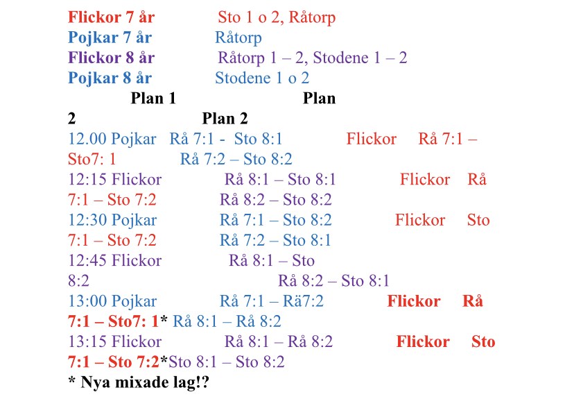 Hej! Vi samlas kl. 11:30 i morgon. Första matchen borde vara kl. 12:15 och sista 13:15 (lite rörigt spelschema vi fått från klubben). Matcherna är 10 min. Vi slutar därmed kl. 13:25. Jag har beredskap över helgen och kan bli tvungen att hastigt lämna eller inte alls kunna medverka, så ev. kanske en förälder behöver coacha ena laget. Allt gott, Erik